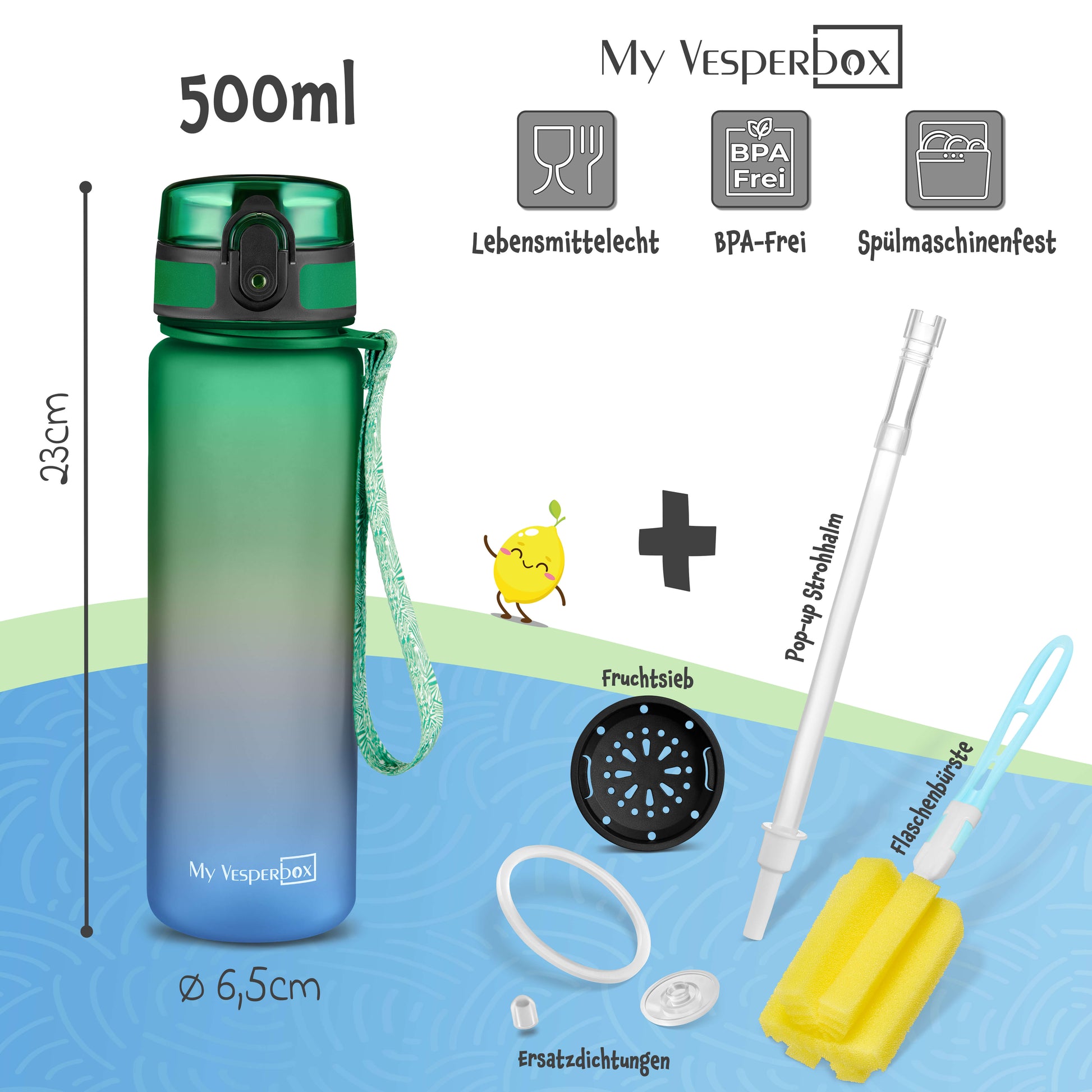 Flasche, Deckel und Strohhalm sind spülmaschinengeeignet. Eine Reinigungsbürste ist im Lieferumfang enthalten – ideal zur Entfernung von Fruchtrückständen am Boden.